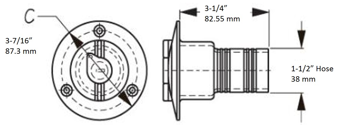 Gas Cap  A = 1-1/2" Hose     B = 3"     C= 3"
