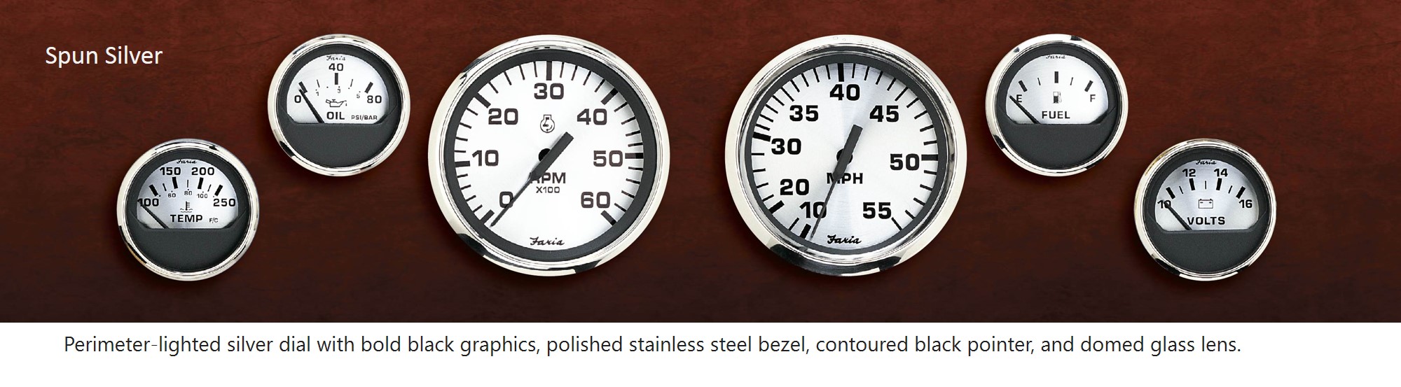 Perimeter-lighted silver dial with bold black graphics, polished stainless steel bezel, contoured black pointer, and domed glass lens.